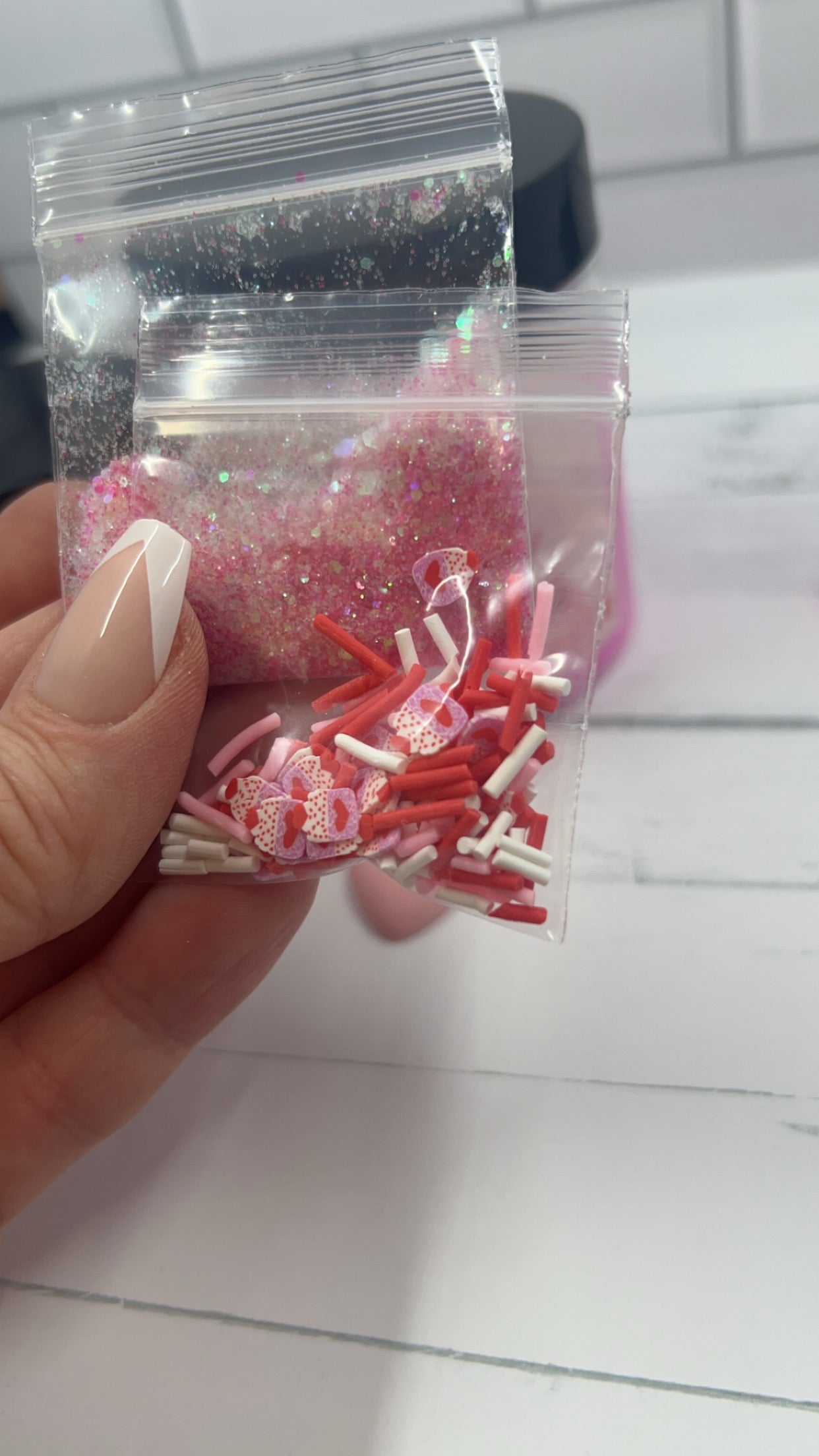 Cupid’s cupcake fluff is a candy cupcake scented cloud dough slime that comes with an avalanche glaze that smells like Valentine's lollipops! Add it to your slime or play with it separately. You also get an adorable cupcake sprinkle mix, one random heart charm and glitter as an ad-in option, this kit is small batch and available for a limited time only!